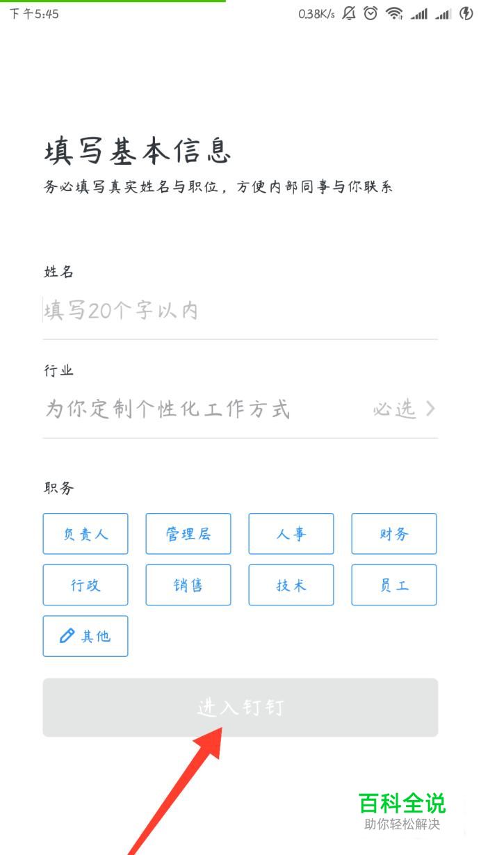 然后在这个页面填写你的基本信息,包括姓名(最好是真实姓名,方便与同事联系)、从事的行业以及职务,填写完之后点击“进入钉钉”。