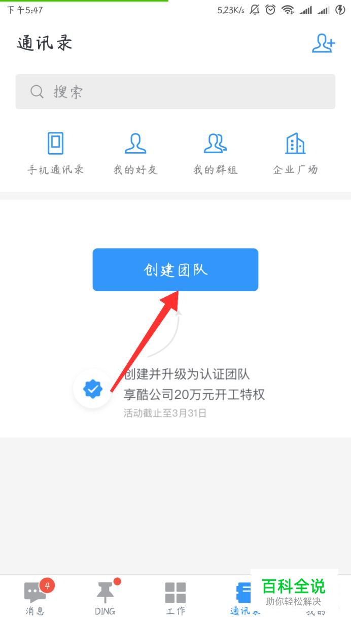 然后就正式进入钉钉页面啦,如果你是管理人员可以创建自己的团队,如果只是普通工作人员,可以在不同页面里面加入你的群组或者添加好友。