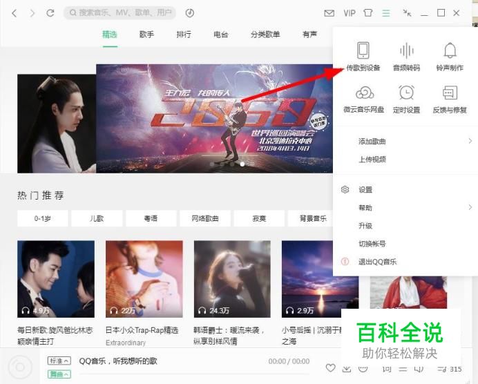 首先我们打开QQ音乐PC端,点击传个到设备 如图