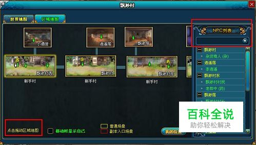二、地图说明:点击右上角的“地图”,可以查看地图的详细信息,地图分为区域地图和世界地图 1、区域地图:显示当前区域的所有地图信息,地图按照适应人物等级从低到高排列,使用鼠标点击,可拖动地图;地图内用不同颜色的方框,标注普通地图和副本入口;地图内使用小人图标显示人物和NPC。 右边 NPC列表 点击可以显示NPC所在地图的方位,寻找NPC位置十分方便。 比如:飘渺村分为:飘渺村西——飘渺村——飘渺村东——飘渺山(2-4级)——山洞(4-5级)——清泉谷(6-8级)——海滩(8-9级)——飘渺崖(9-10级)