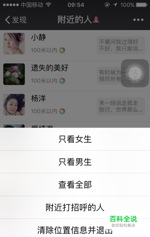 点击进去,这时候会看到很多搜索到的附件的微信用户,接着点击右上角的三个点,弹出以下选项,点击清除位置信息并退出。