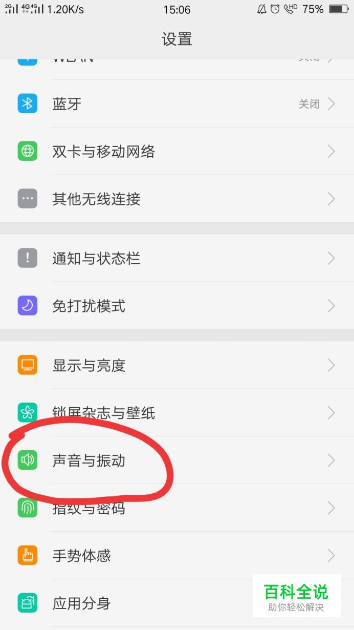 进入设置后,滑动屏幕,找到“声音与振动”,点开。