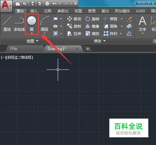 选择直线命令,绘制出一条直线,然后再在绘图里找到圆形命令,如图所示: