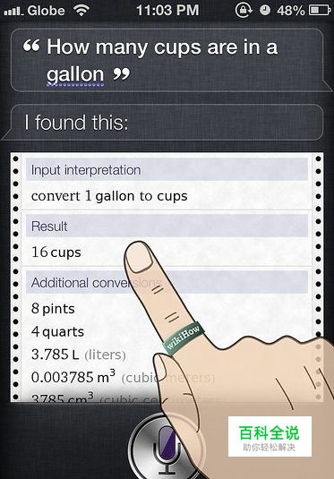 让Siri给你返回某些信息。你可以向Siri提问,例如"一加仑相当于多少个杯子的容量?"Siri将查看问题并为你返回相关的答案。