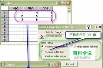 直接转换 -- Worksheet 中含有 Matrix 的 XY 值 这里假设 worksheet 数据的组织结构与 Matrix 一样 (X 按列排),并且 X 值存在第一行,Y 值存在第一列。注意,对于这样直接转换,X Y 的值必须时均匀间隔的。 若 X 值按行排,则选择 Y varies acros columns,转成的 Matrix 会转置 (这里有点晕哦 :-))