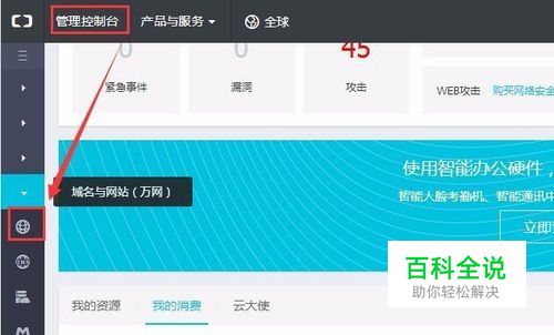 首先登陆阿里云管理控制台,并且点击控制台左侧的域名菜单进入我们购买的域名列表中。