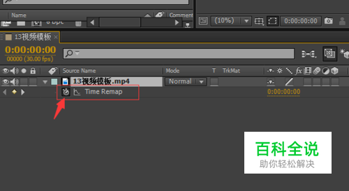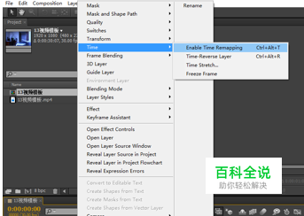 启用时间重置:选中视频素材后,右键→展开“Time(时间)”→选择“Enable Time Remapping(启用时间重置)”。此时视频素材的下面会出现“Tiem Remap”属性。