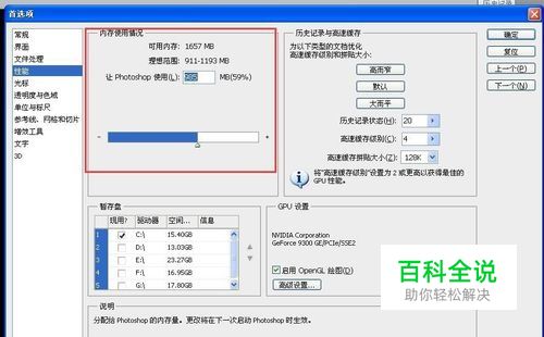 第一个内存使用情况是指PS运行占用电脑内存的占用率,占用率越高,ps运行就越流畅。