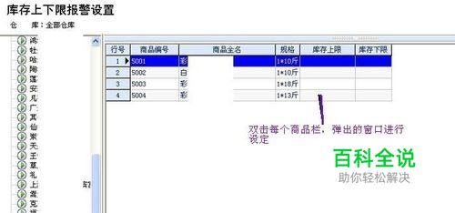 双击商品栏,会弹出设置窗口,通常上限的设置使用不大,但为了不阻碍库存商品的数量上限,我们可以尽量将上限数量设置多一些。而下限的数量是常使用的,需要按需求设定。值得注意的是这个数量指的是基本数量, 如果你的基本数量设定的是瓶,个等小单位,在设定下限的时候要注意不要设低了。