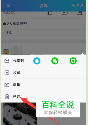 这时会出来一个下拉菜单,里面有四项内容,分享到,收藏,编辑,删除。点击最后一项删除。