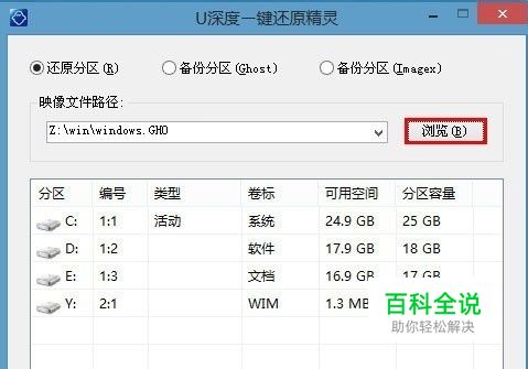 登录到PE系统桌面后,自动弹出pe系统自带的一键还原精灵工具,点击“浏览”按钮浏览事先存放在u盘中的ghost win10系统镜像包。如下图所示: