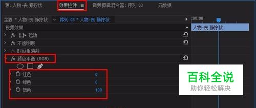 4、选中v1视频,在“效果控件”面板中找到“颜色平衡” 修改为 红色 0 绿色0 蓝色100 选中v2视频,在其“效果控件”-“颜色平衡” 修改为 红色 0 绿色100 蓝色 0 选中v3视频,在其“效果控件”-“颜色平衡”中 修改为 红色100 绿色0 蓝色0