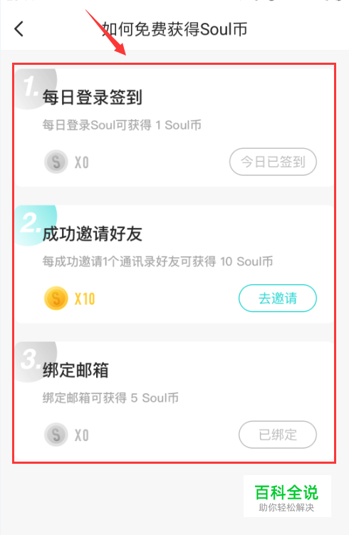 点击该页面的“免费获取”按钮,可知可以通过日常签到、邀请好友、绑定邮箱免费获取soul币。其中签到和邀请好友可以多次进行,绑定邮箱只能做一次。