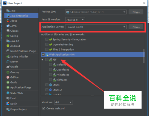 先点击左边“Java Enterprise”,然后在右边“Application Server”处点击“New”将tomcat服务器导入,下方勾选“Web Application”,点击“Next”。