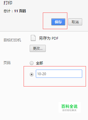 在打印页面中下面的红框处输入起止的页码,然后点击保存按钮,此时会弹出“另存为”按钮。此时即可将此pdf文件选中的一段独立保存为另一个pdf文件。