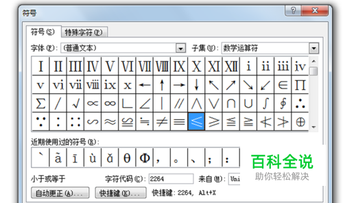 字体设置为普通文本,子集设置为数学运算符,找到小于等于号,点击插入。