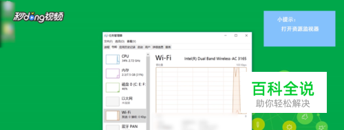 点击“性能”,再选择连接的网络类型,再点击下方的“打开资源监视器”