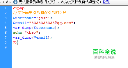 预览效果如图,单引号不解析变量,双引号解析变量 附上源码 <?php //字符串单引号和双引号的区别 $username='joke'; $email="3333333333@qq.com"; var_dump($username); echo "<br>"; var_dump($email); echo "<br>"; echo 'this is a test <br/>'; echo "hello world<br/>"; echo "<br>"; echo '$username'; echo '<br/>'; echo "$username"; ?>