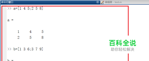 第一步打开matlab,在命令行窗口中输入 a=[1 4 5;2 5 8],b=[1 3 6;3 7 9],按回车键,创建a和b两个矩阵,如下图所示:
