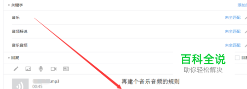 先实现音频的自动回复吧,在里面建一个音乐音频的规则,上传好MP3文件,这个音频时间是不超过60s的,大小不超过5M记住哟,如果不知道MP3文件怎么转换下个格式工厂转换很容易的
