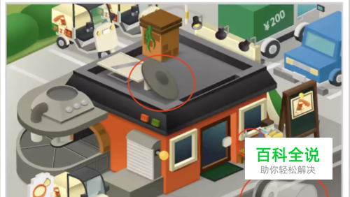 招牌靠在披萨店的右侧。外卖的车子都走了以后,会有个人驾着披萨形状的飞机过来。点击下图红圈里的位置,获得招牌的广告。将广告牌和披萨广告放上屋顶。