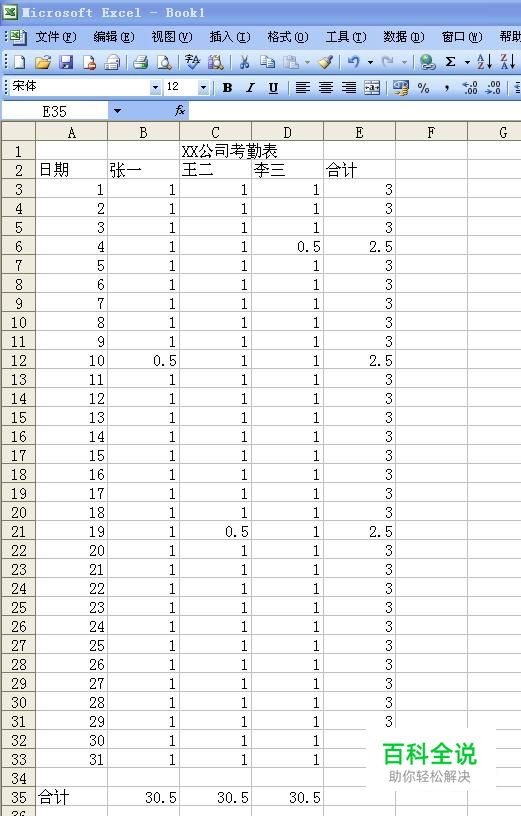 用EXCEL制作考勤表,简单方便,每天每人只需输入一个数字,就能自动计算出每个人的出勤情况,下面就教您怎么制作考勤表。