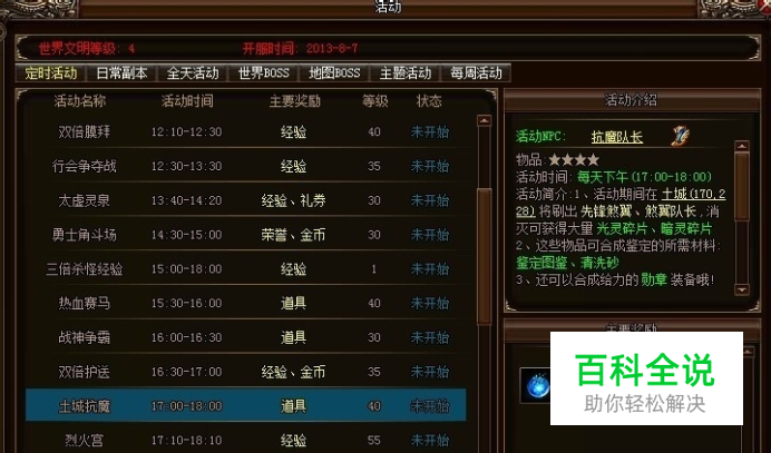 《烈火战神》土城抗魔活动要求:玩家等级等于或大于40级即可在每天下午(17:00—18:00)时间段内在土城坐标(190,208)处进行土城抗魔活动,成功完成活动的玩家可以获得大量的光灵碎片、暗灵碎片和相应的经验值。光灵碎片、暗灵碎片可合成鉴定的所需材料:鉴定图鉴、清洗砂,还可以合成给力的勋章装备。