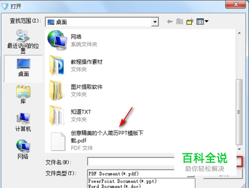 点击页面左下角“打开”按钮,随即在弹出的“打开”页面中,在文件类型这里选择相应的格式,这样便于我们快速的找到文档所在的位置,单击选中pdf,然后再单击“打开”就导入成