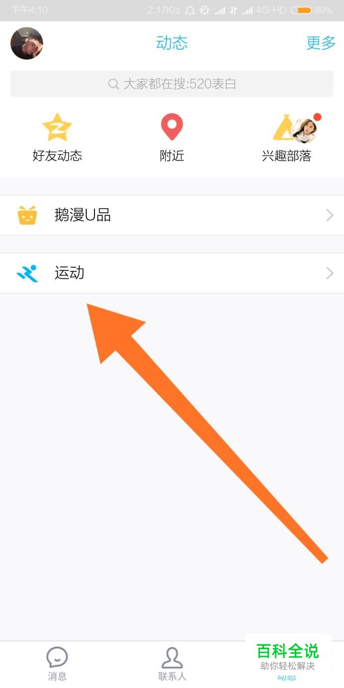 首先进入手机QQ“动态”页面,点击进入“运动”。