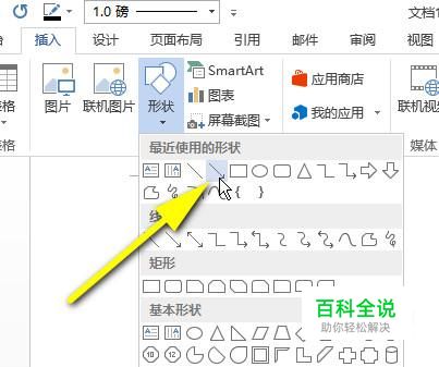 启动软件,新建一个空白文档;点击插入选项卡,在展开的内容中再点“形状”,从中选择:箭头