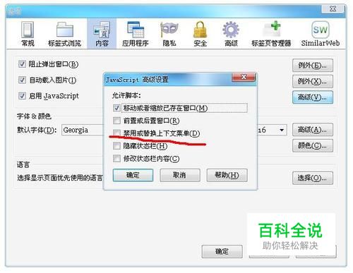 启动火狐浏览器,点击菜单栏的 工具/选项,点击“内容”tab,接下来会弹出“JavaScript高级设置” ,请把“禁用或者替换上下文菜单”前面的对勾去掉。