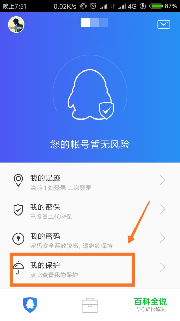 下载安装完之后点击进入QQ安全中心,将你想设置的QQ号登陆上,进入之后,在图片最下面点击我的保护。