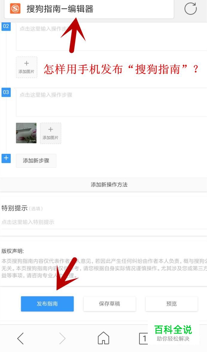 进入“搜狗指南”的首页,与电脑的界面一样了,用自己的帐号,便可编辑、发布搜狗指南了,也可上传图片。