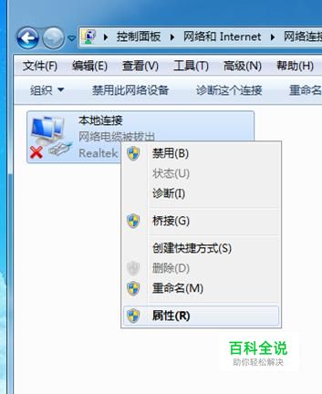 在出现的界面左边点“更改适配器设置”,然后可以看到有个“本地连接”,在上面右键单击,在弹出的菜单里点“属性”。