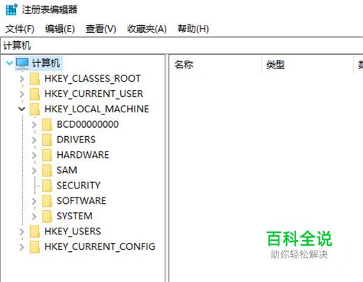 然后系统会弹出注册表编辑器,然后我们看到左边菜单栏有个HKEY_LOCAL_MACHINE选项,点击它。