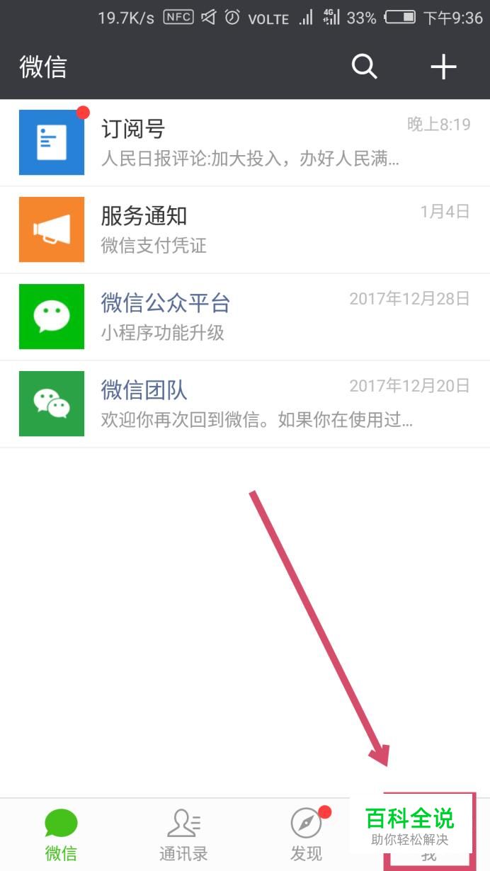 打开微信,在屏幕右下方找到“我”,如下图所示。