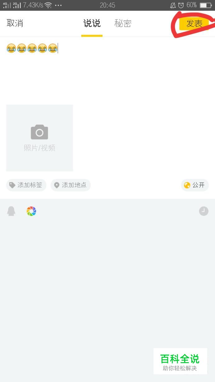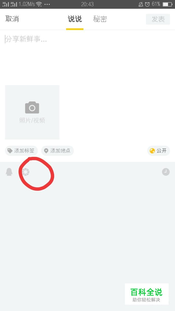 打开QQ空间发布说说,然后在发表页面中,找到朋友圈的图标。