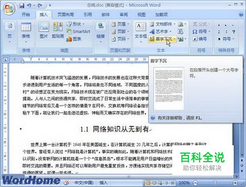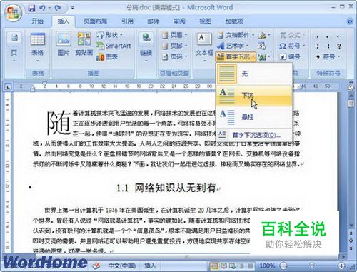 怎样在Word2007中设置首字下沉或悬挂