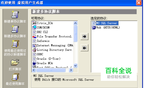 录制基本的用户脚本 创建用户脚本需要用到VuGen。提示: 运行VuGen 最好在1024*768 的分辨率下, 否则有些工具栏会看不到。 启动Visual User Generator 后, 通过菜单新建一个用户脚本, 选择系统通讯的协议。 这里我们需要测试的是Web 应用,同时考虑到后台SQL数据库所以我们需要选择Web(HTTP/HTML)协议+SQL SERVER协议,确定后, 进入主窗体。通过菜单来启动录制脚本的命令。