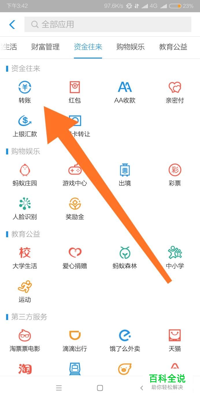然后找到“资金来往”页面下的“转账”,点击进入。