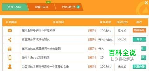 1是日常任务,3个,一个是分享直播给好友,二是签到,(就是在关注的主播里签到2个),三是用手机斗鱼看直播5分钟,然后可以在电脑上操作领取任务鱼丸。