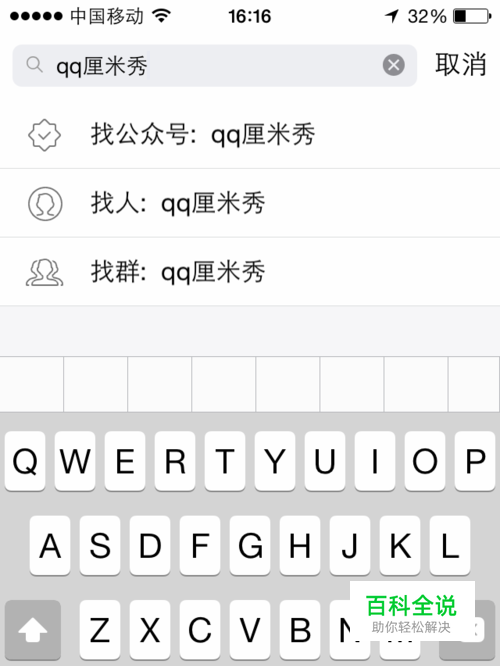 首先打开qq。在联系人页面中,点击右上角的添加。然后选择找公众号,输入qq厘米秀。