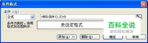 第四步,单击“条件1”下面左侧方框右边的下拉按钮,在随后出现的下拉列表中,选择“公式”选项,并在右侧的方框中输入公式:=MOD(ROW(),2)=0。
