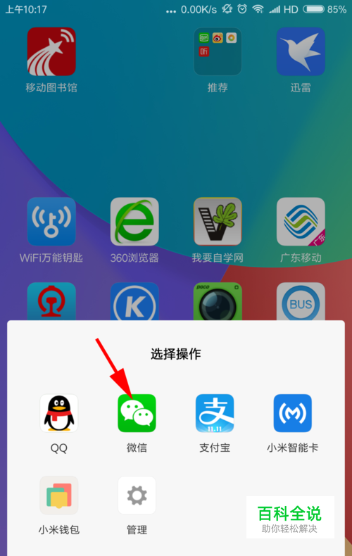 将羊城通紧贴着手机背面,手机会识别芯片,进入选择操作界面,选择微信
