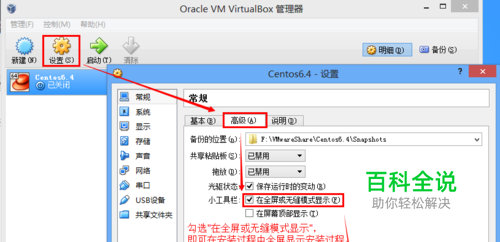 设置虚拟机显示,方便在系统安装过程中查看全屏信息。 ◆操作过程:在VirtualBox管理器界面;点击【设置】→选择“常规”中“高级”→勾选“在全屏或无缝模式显示”→点击【确定】→完成设置。