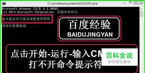第二种情况:命令提示符已被系统管理员停用。 开始 - 运行(输入CMD)回车,打开的命令提示符窗口显示:命令提示符已被系统管理员停用。