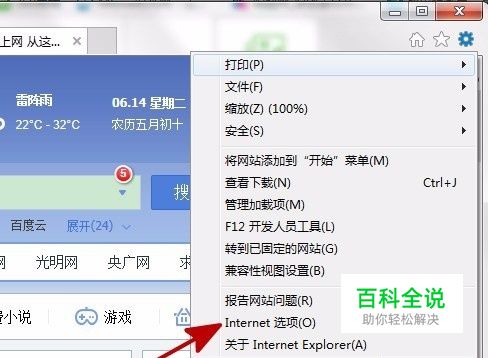 找到浏览器上的【工具】,打开【Internet选项】。