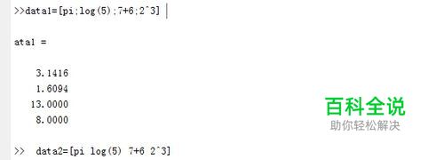 在Matlab的命令窗口中,直接输入数据,使用【分号;】或者【空格 】创建一维数组。例如输入: data1=[pi;log(5);7+6;2^3] 得到: data1=[pi;log(5);7+6;2^3] 输入: data2=[pi log(5) 7+6 2^3] 得到: data2 = 3.1416 1.6094 13.0000 8.0000