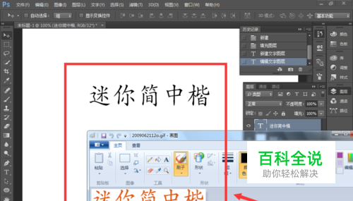 然后打开Photoshop软件,选择【文字工具】,然后在字体设置那里找到上面安装成功字体名称,然后输入文字【迷你简中楷】,对比下载的字体图片,是不是同一种字体,如图: