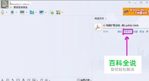 打开QQ接收文件 QQ作为常用的通信软件,在接收和转发文件方面是极其方便的,感觉比邮件好用多了。现在,小编就收到了同事发来的文件,点击“ 另存为”接收。